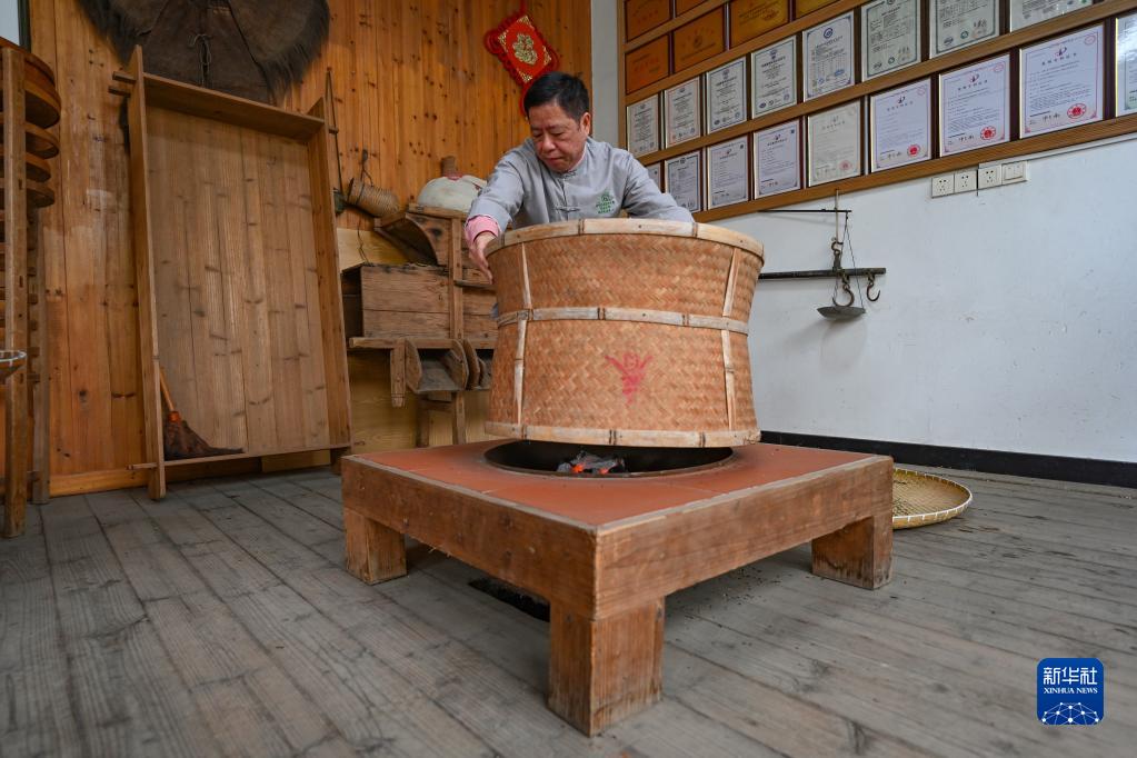 12月16日,在福州茉莉花茶制茶工坊,福州茉莉花茶傳統窨制工藝大師傅天甫進行制茶的第五道工序“烘”?!昂妗笔菍⒉枞~均勻攤放在竹制焙籠上進行烘焙。