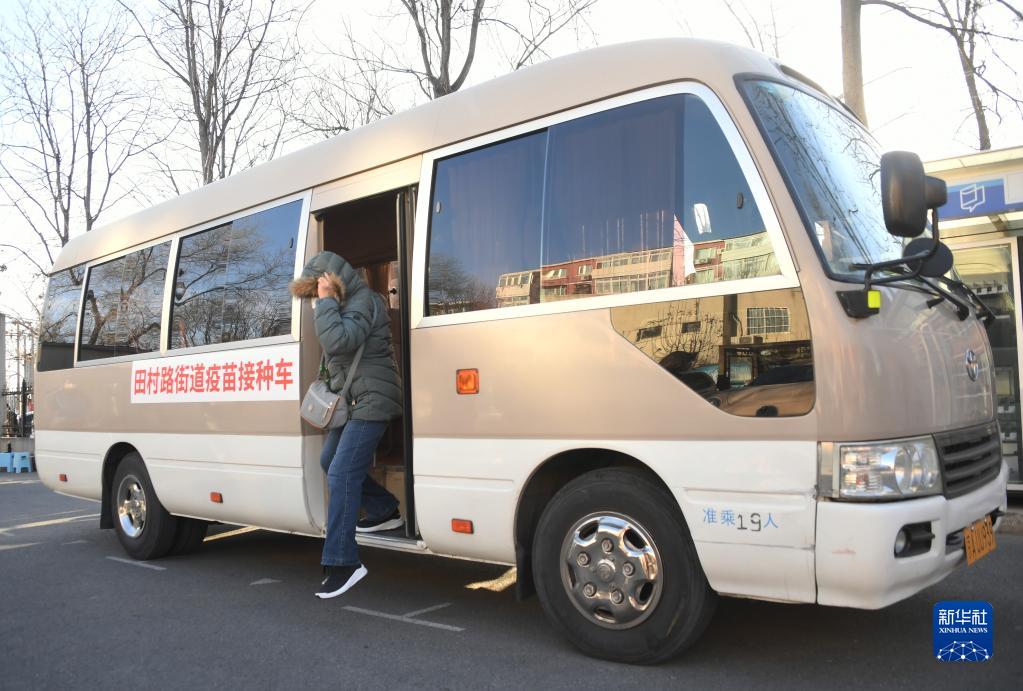 12月17日,在北京市海淀區田村路街道新冠疫苗臨時接種點,一名老人從“暖心巴士”下車準備接種新冠疫苗。