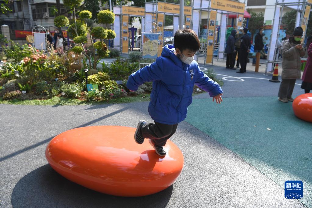 12月17日,小朋友在南寧市青秀區(qū)南湖小區(qū)改造后的中心花園玩耍。