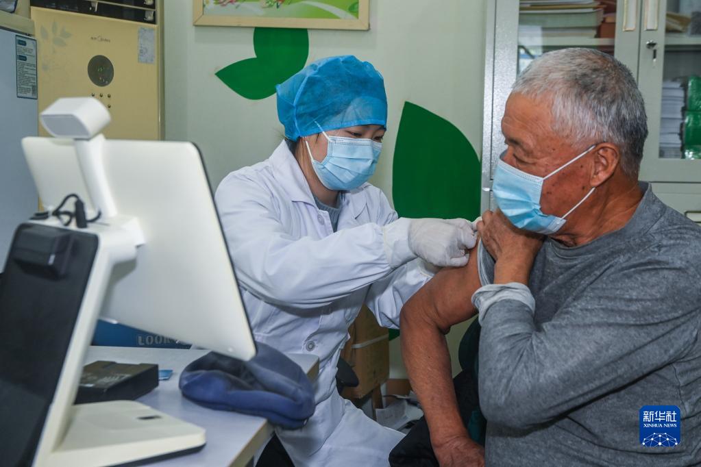 12月13日,浙江省湖州市吳興區(qū)東林鎮(zhèn)衛(wèi)生院的醫(yī)務(wù)人員在給老年人進行新冠疫苗接種。