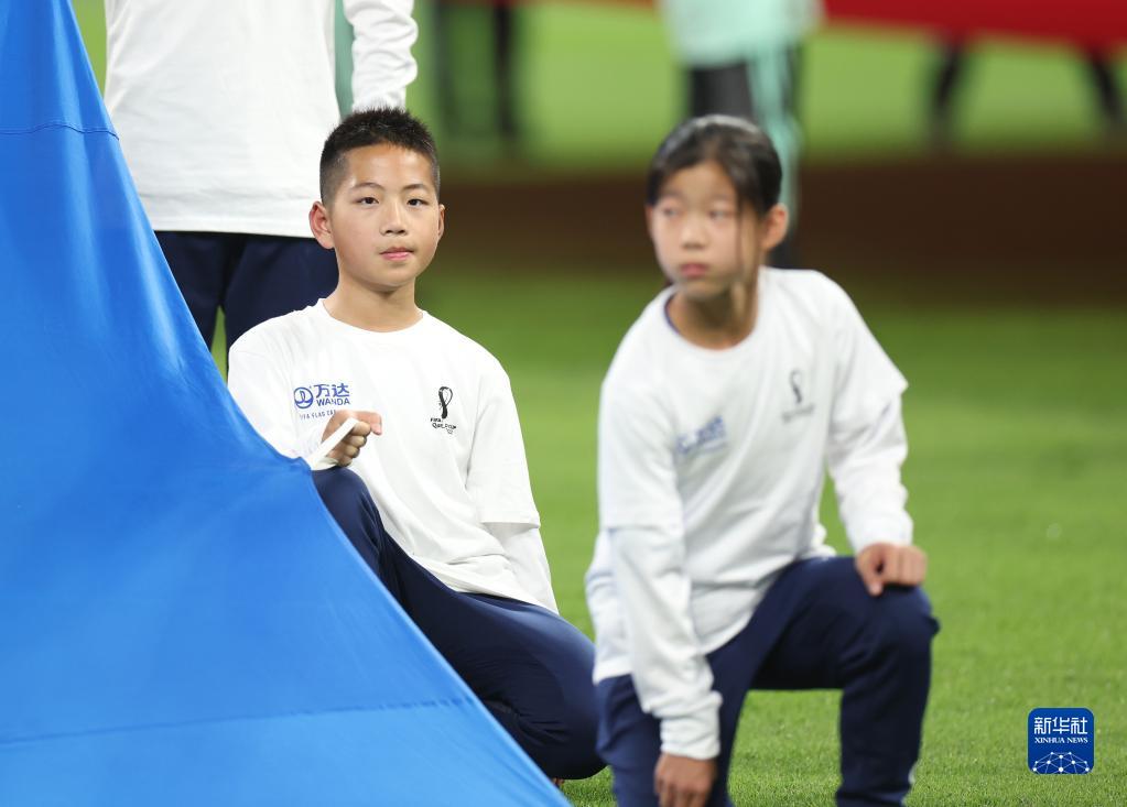 金粲璨(左)在卡塔爾世界杯三、四名決賽開賽前作為護旗手出場(12月17日攝)。