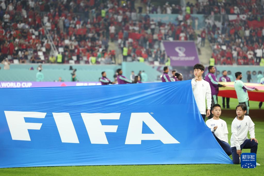 金粲璨(右二)在卡塔爾世界杯三、四名決賽開賽前作為護旗手出場(12月17日攝)。