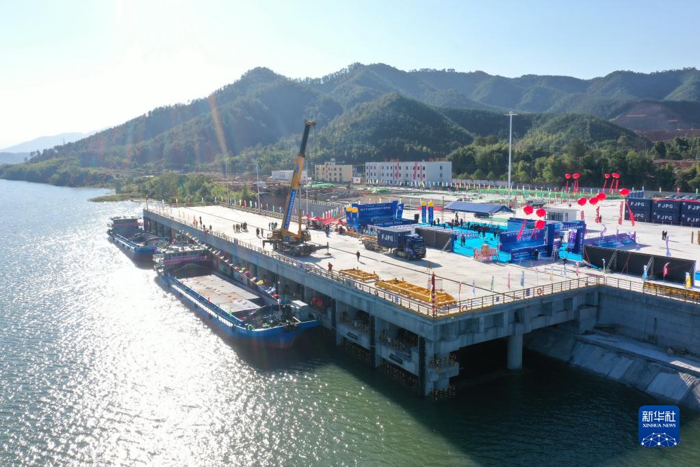 12月18日,“武夷2號”新能源貨船停靠在南平港延平新城港區洋坑碼頭裝運貨物(無人機照片)。