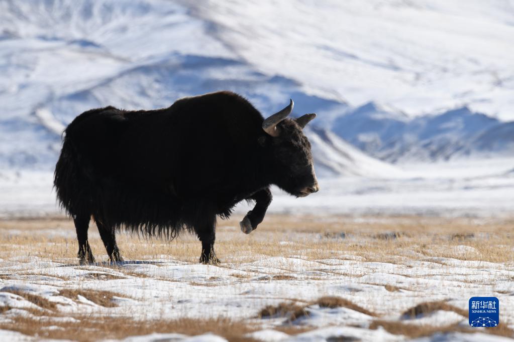 一場降雪過后,地處甘肅省酒泉市阿克塞哈薩克族自治縣境內的哈爾騰高原被皚皚白雪覆蓋,成群的藏野驢、野牦牛等野生動物在高山雪地間戲雪覓食,為冬日的哈爾騰增添了不少生機與活力。