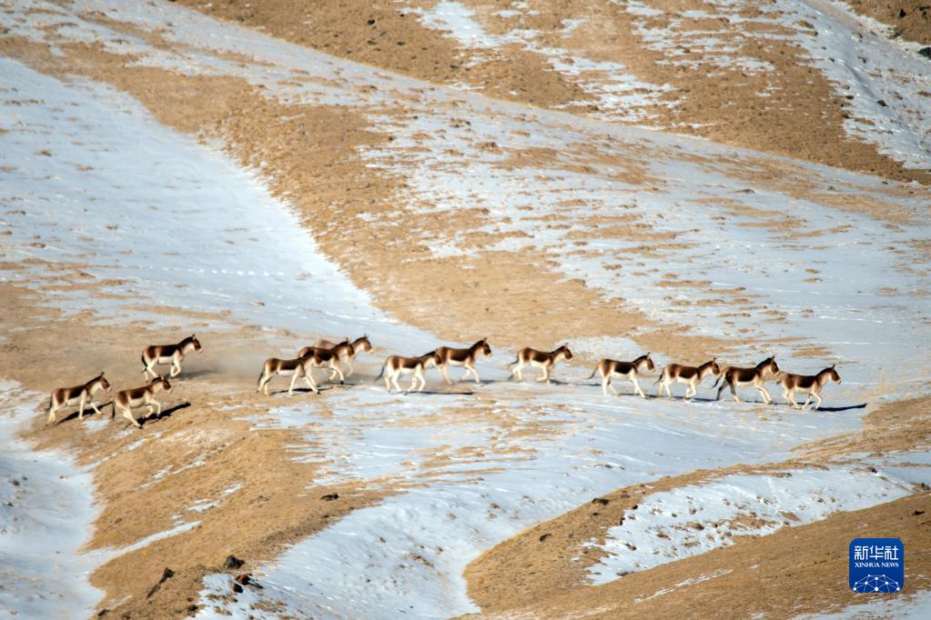 一場降雪過后,地處甘肅省酒泉市阿克塞哈薩克族自治縣境內的哈爾騰高原被皚皚白雪覆蓋,成群的藏野驢、野牦牛等野生動物在高山雪地間戲雪覓食,為冬日的哈爾騰增添了不少生機與活力。