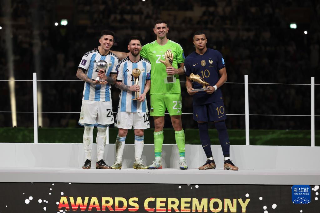 12月18日,在本屆世界杯上獲得最佳新秀獎的阿根廷隊球員恩佐·費爾南德斯(左一)、獲得金球獎的阿根廷隊球員梅西(左二)、獲得金手套獎的阿根廷隊守門員馬丁內斯(右二)與獲得金靴獎的法國隊球員姆巴佩在頒獎儀式上合影。