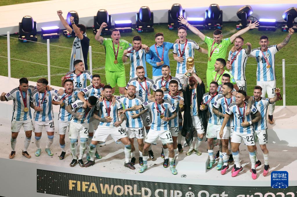 12月18日,阿根廷隊(duì)球員在頒獎(jiǎng)儀式上慶祝奪冠。