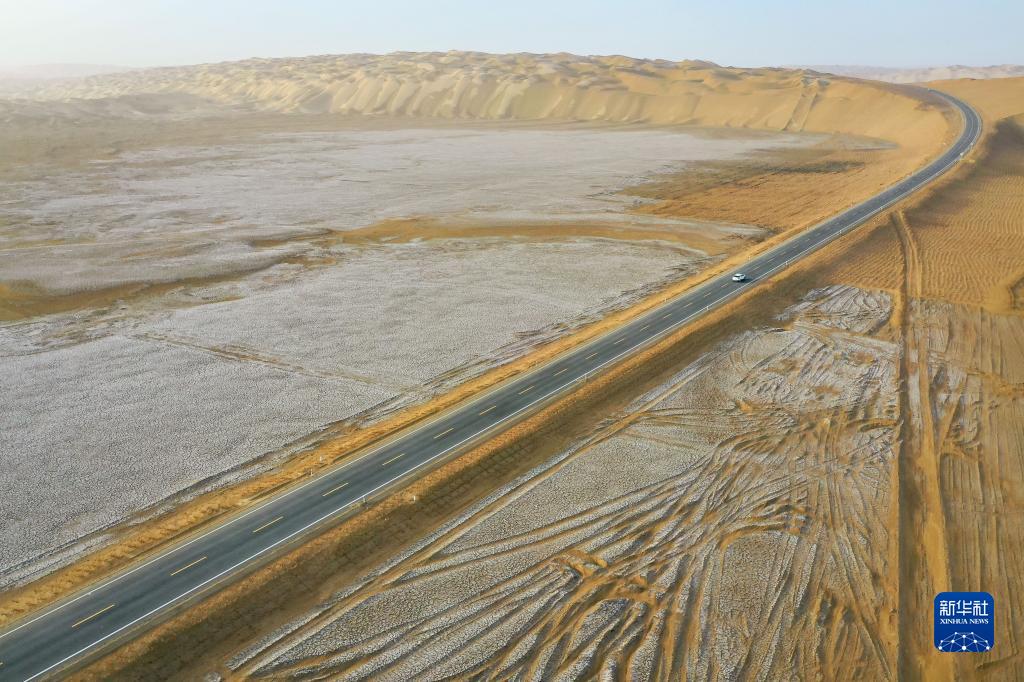 工作車輛在新疆尉犁至且末沙漠公路上行駛(2022年6月26日攝,無人機照片)。2022年6月30日,尉犁至且末沙漠公路正式通車,成為我國建成的第三條穿越“死亡之海”塔克拉瑪干沙漠的交通要道。
