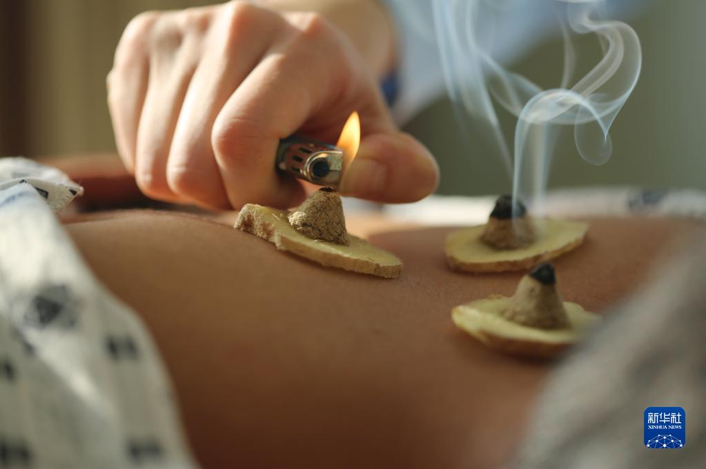 12月19日,山東省臨沂市沂南縣中醫醫院,醫務人員為市民做隔姜灸。新華社發(王彥冰 攝)