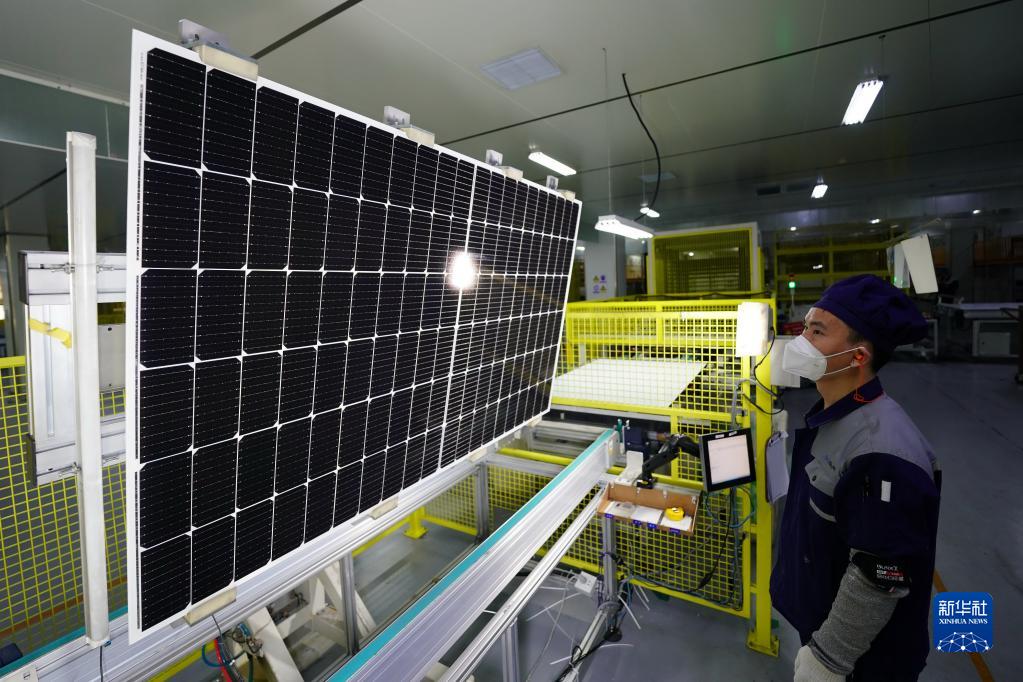 12月19日,位于河北邢臺經濟開發區的晶澳(邢臺)太陽能有限公司工人在檢測太陽能組件質量。