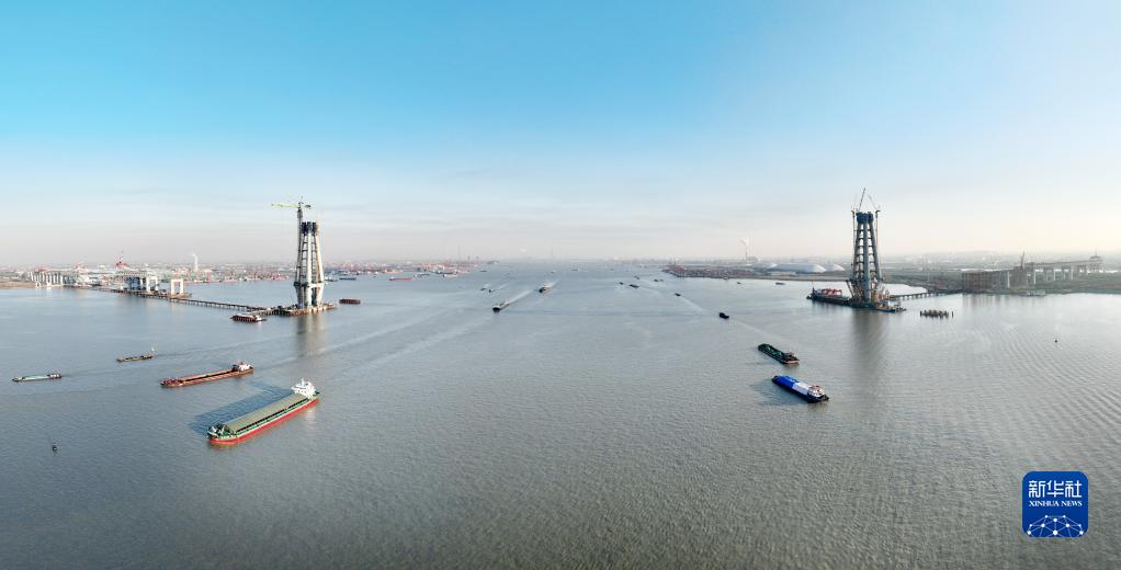 12月19日,常泰長江大橋主塔施工如火如荼(無人機照片)。