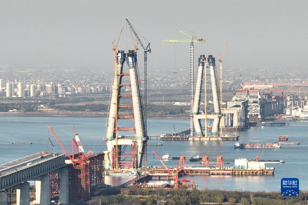 12月19日,常泰長江大橋主塔施工如火如荼(無人機照片)。