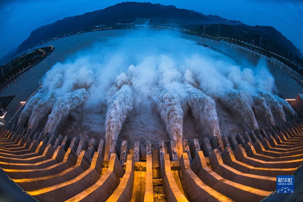 這是2020年8月19日拍攝的長江三峽水利樞紐工程開啟泄洪深孔泄洪(無人機照片)。