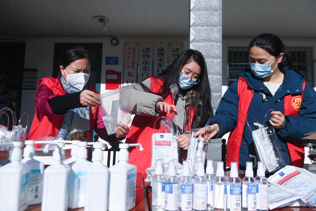 12月20日,在諸暨市東白湖鎮東白山村村委會,愛心志愿團的志愿者們分裝愛心防疫包,愛心防疫包里有愛心人士捐贈的抗原檢測試劑、消毒液、口罩、防疫指南等。