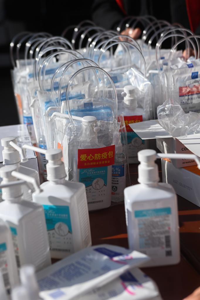 12月20日,在諸暨市東白湖鎮東白山村村委會,愛心志愿團的志愿者們正在分裝愛心防疫包。