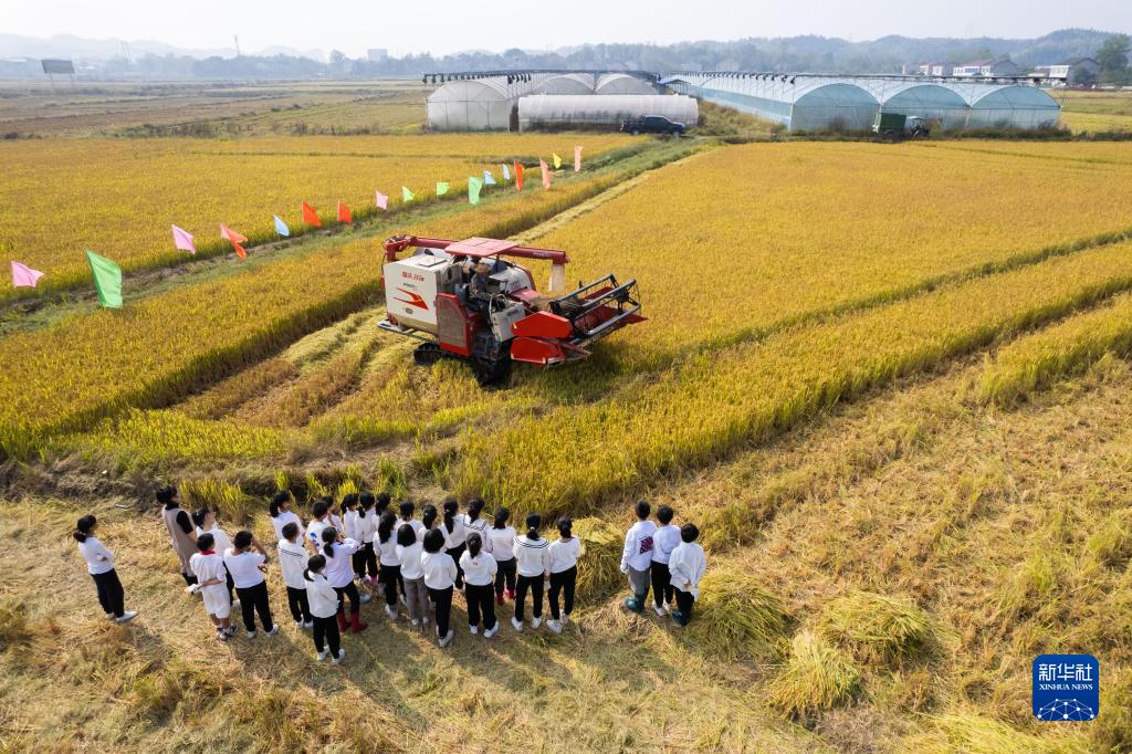 11月1日,湖南省常德市桃源縣寺坪中學在農田開展“田間課堂”活動。這是學生觀看農機收獲水稻(無人機照片)。