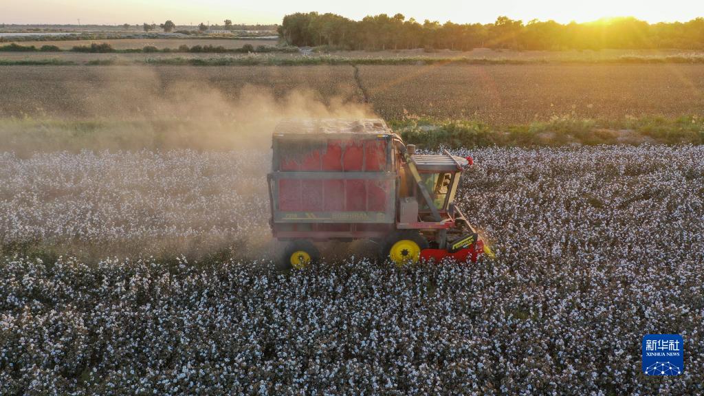 9月26日,新疆沙雅縣塔里木鄉其格格熱木村村民駕駛采棉機采收棉花(無人機照片)。
