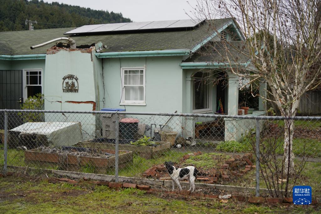 12月21日,在美國加利福尼亞州北部芬代爾,一只狗站在被地震損壞的房屋前。