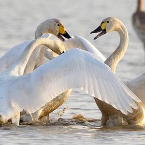 幾只天鵝在南昌高新區(qū)五星白鶴保護小區(qū)嬉戲(12月21日攝)。