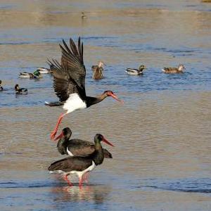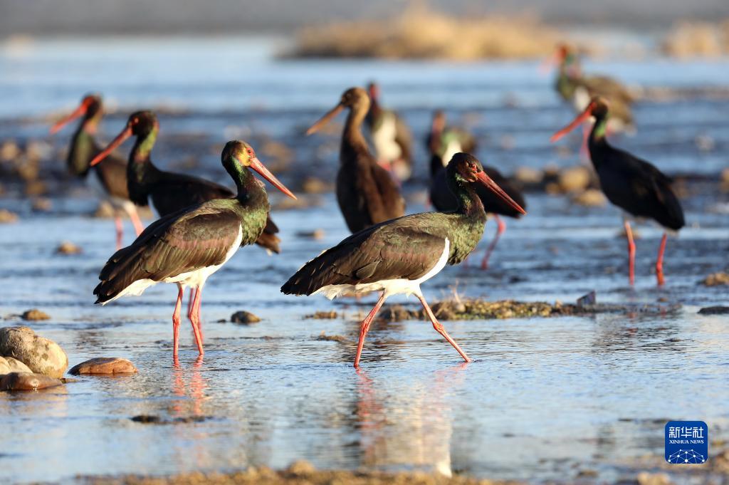 12月22日,一群黑鸛在河北省井陘縣境內(nèi)的綿蔓河覓食。