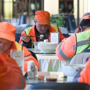 12月22日,環衛工人在西安市新城區一家餐廳吃水餃。