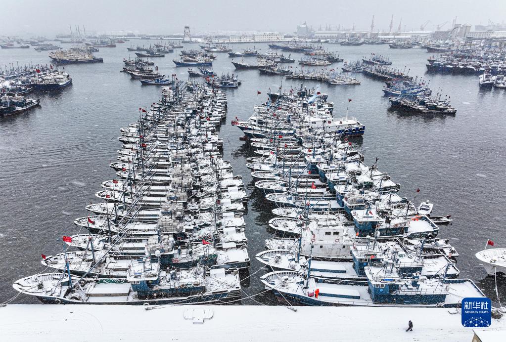 12月22日,漁船停靠在山東省榮成市石島管理區石島漁港躲避暴風雪(無人機照片)。