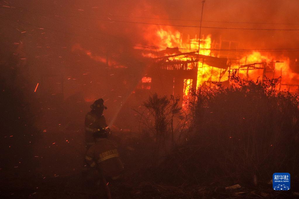 12月22日,在智利海濱城市比尼亞德爾馬,消防員在森林火災現場進行滅火作業。