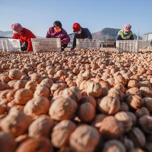 12月23日,農民在遵化市東舊寨鎮石橋頭村一家核桃專業合作社的場院精選核桃。