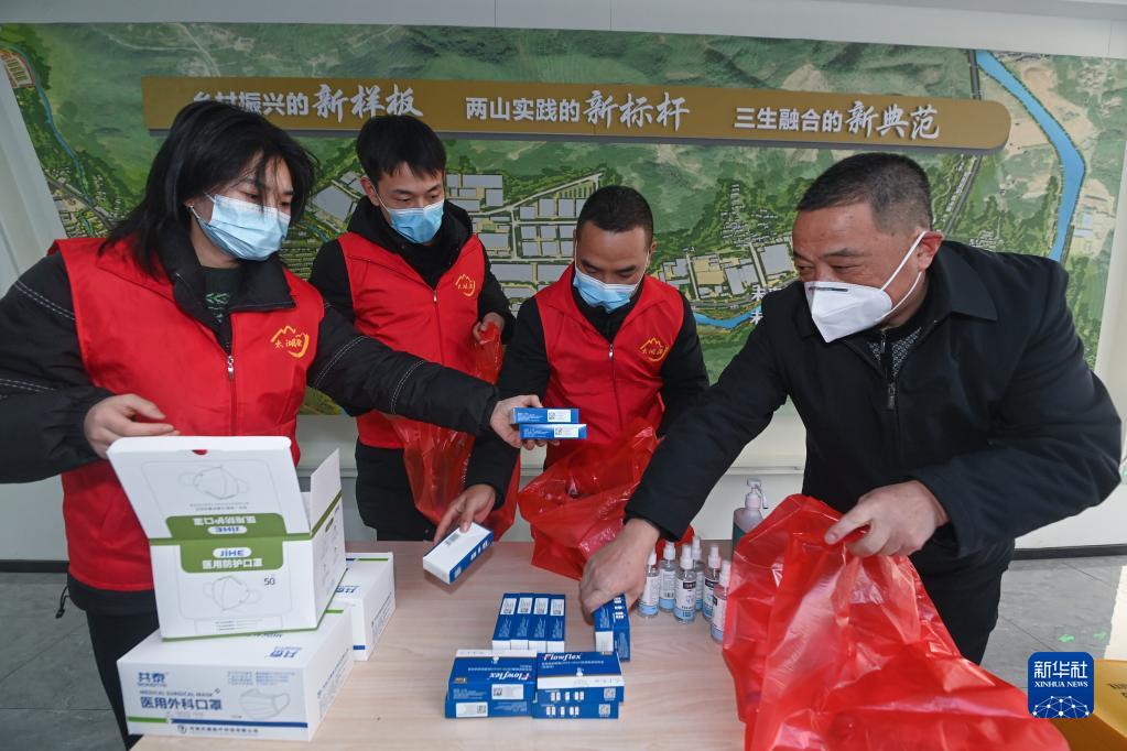 12月23日,在杭州市臨安區太湖源鎮黨群服務中心,村社醫療小分隊的志愿者們在分裝健康禮包,健康禮包里有消毒液、口罩、必備藥品等。