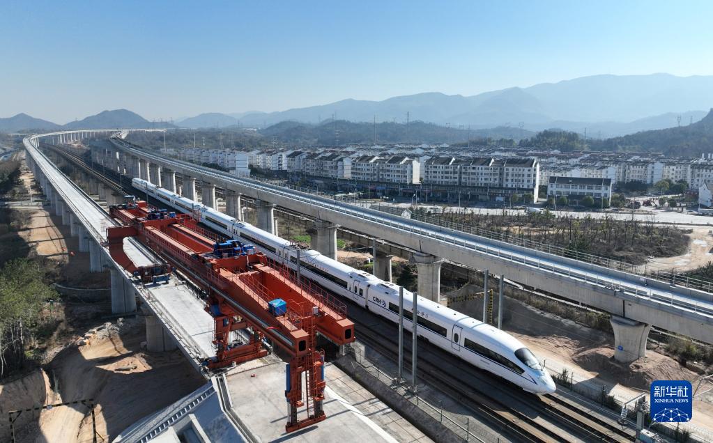 12月23日,在安徽池州,中鐵十一局池黃鐵路站前一標(biāo)最后一榀箱梁架設(shè)完成(無人機照片)。