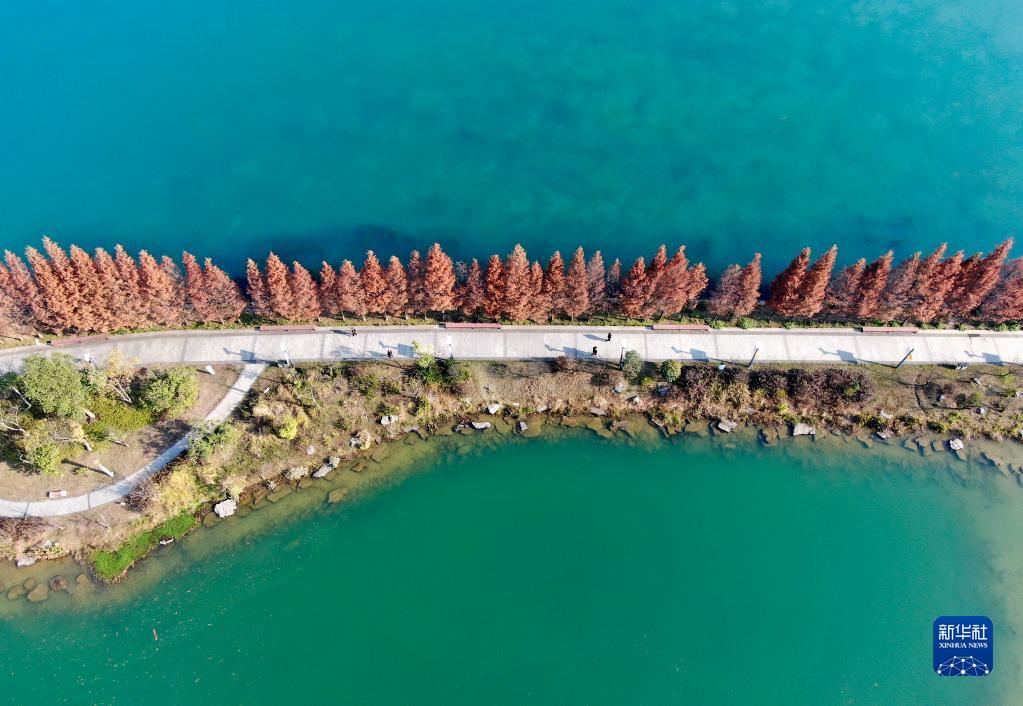 近日,湖南省資興市東江灣城市公園的成片水杉樹色彩艷麗,景色如畫,吸引市民前來游玩。