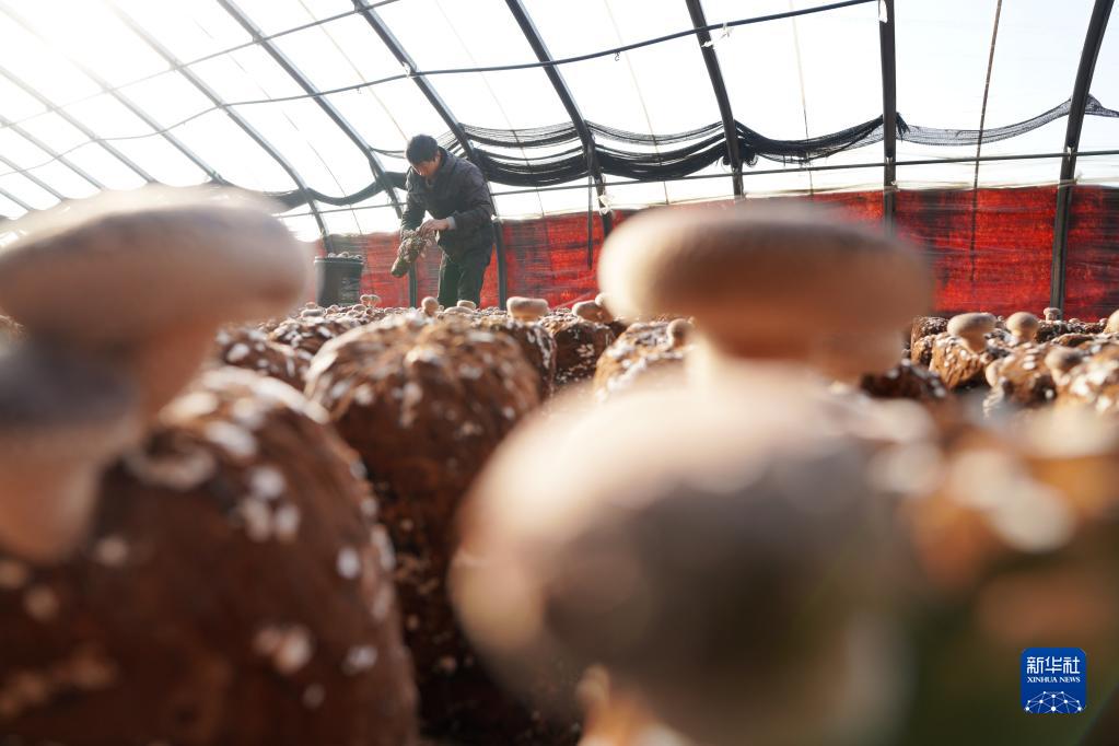 12月23日,內(nèi)丘縣下馬莊村村民在大棚里采摘香菇。