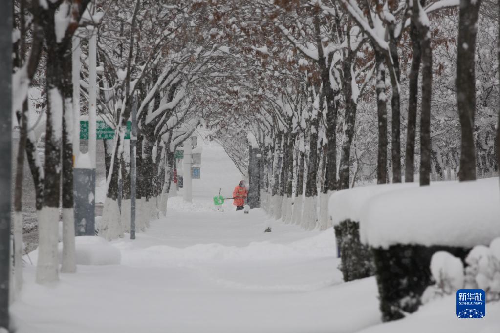 12月23日,在山東省威海市文登區,環衛工人在街道上清除積雪。