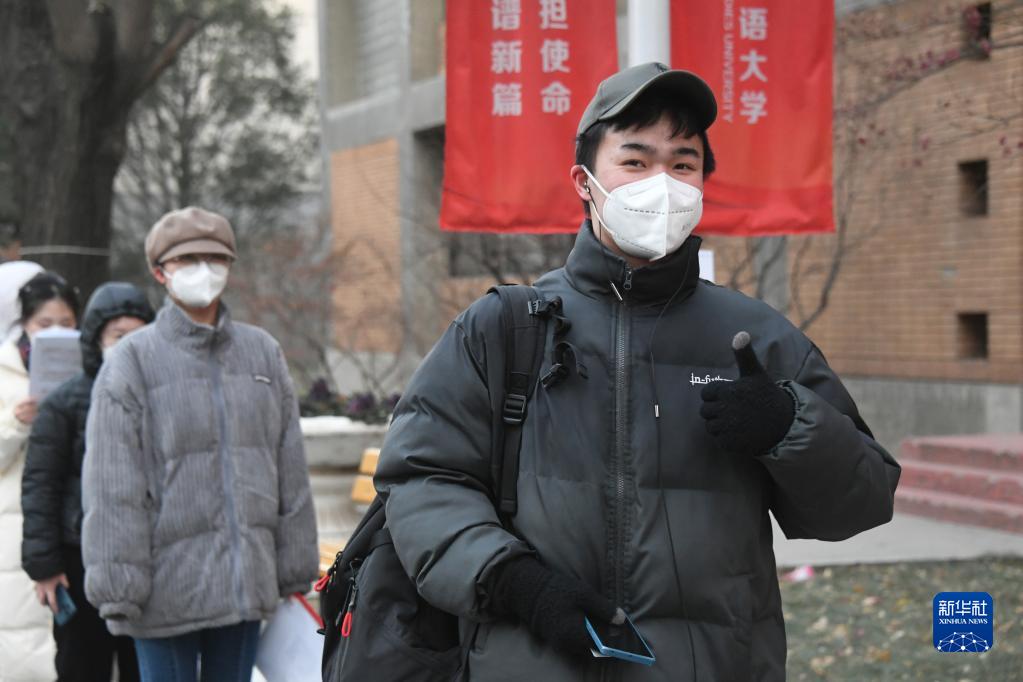 12月24日,在北京外國語大學考點,北京外國語大學歐洲語言文化學院考生杜秋卓(右一)準備進入考場。