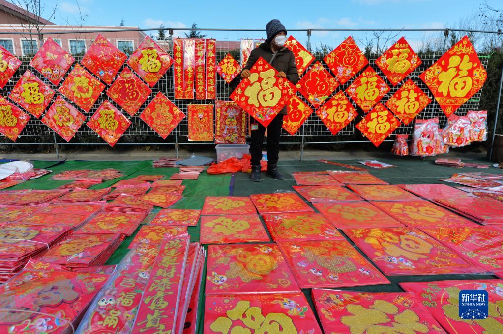 12月24日,在山東省青島市城陽區流亭街道雙埠年貨大集上,一名對聯經銷攤主向顧客展示福字。
