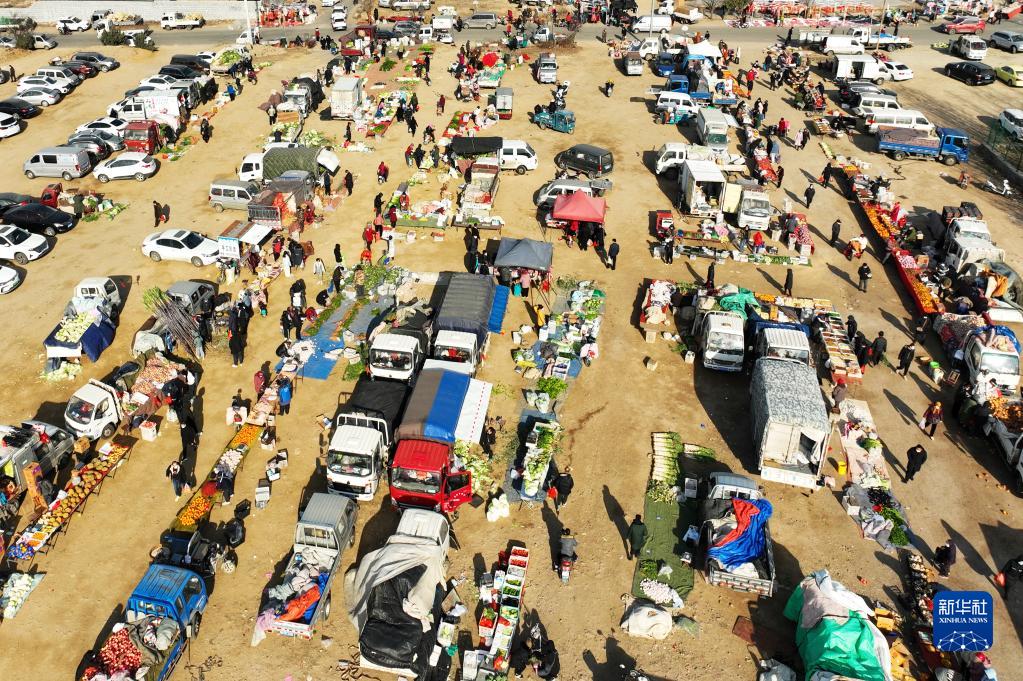 12月24日,在山東省青島市城陽區流亭街道雙埠社區拍攝的年貨大集(無人機照片)。