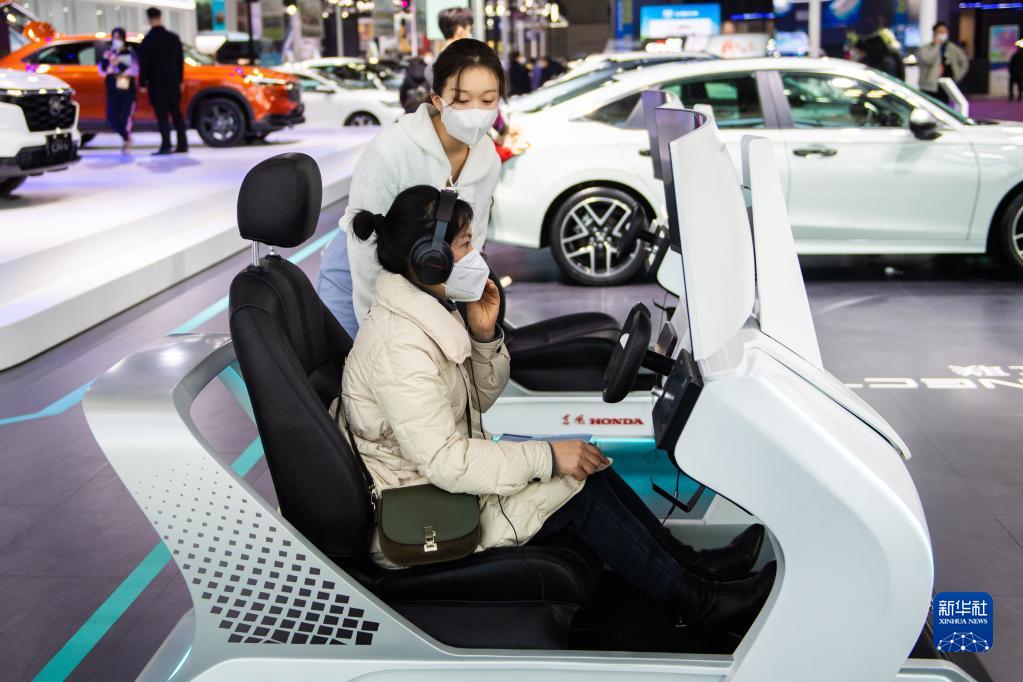 12月24日,在長沙國際會展中心,觀眾(前)在虛擬駕駛艙上體驗。