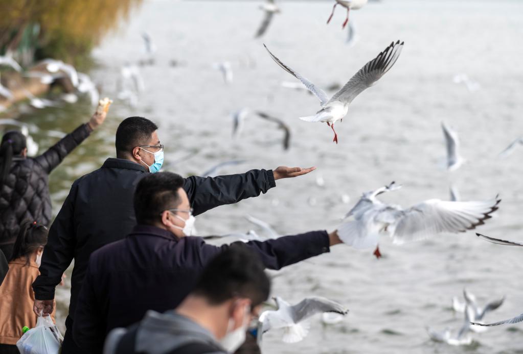 12月24日,游客在昆明滇池海埂公園里喂紅嘴鷗。