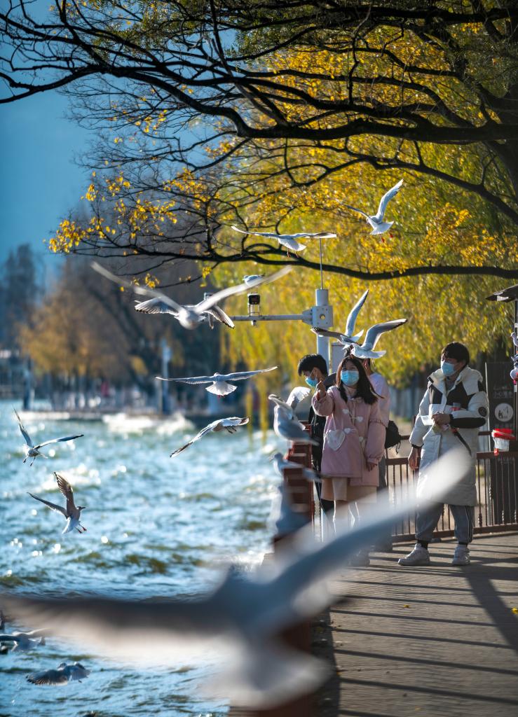 12月23日,游客在昆明滇池海埂公園里喂紅嘴鷗。
