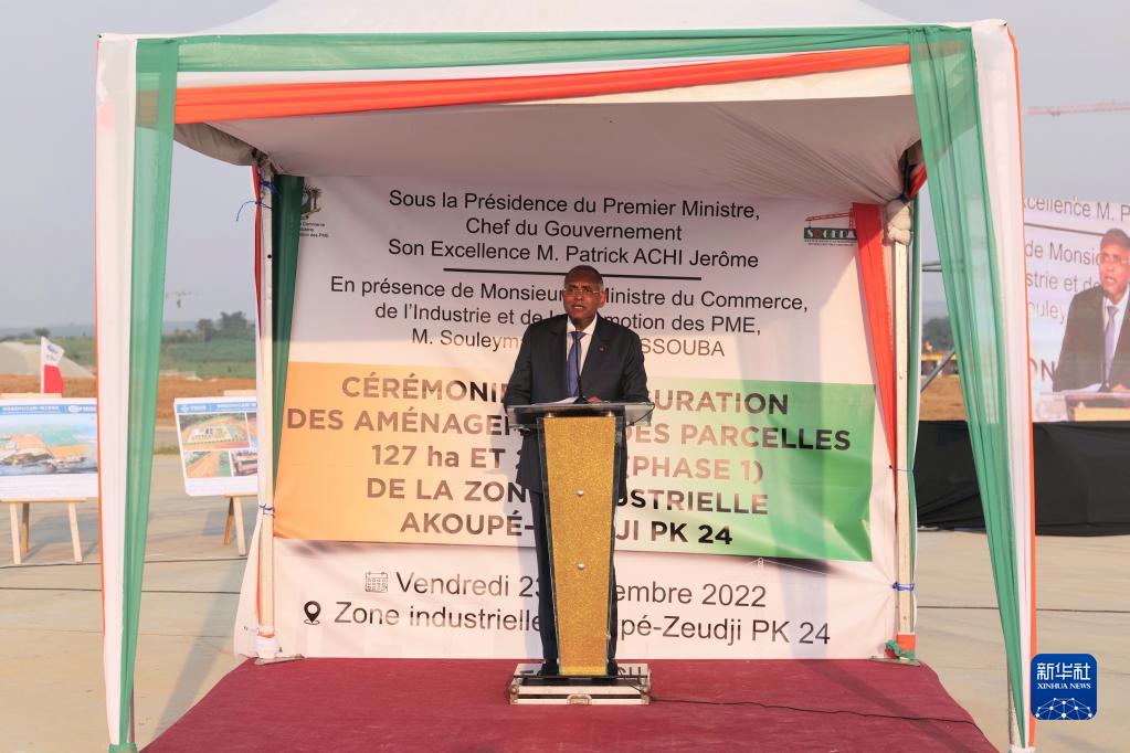 12月23日,在科特迪瓦阿比讓市西北部,科特迪瓦總理帕特里克·阿希在PK24工業(yè)園一期項(xiàng)目竣工儀式上致辭。