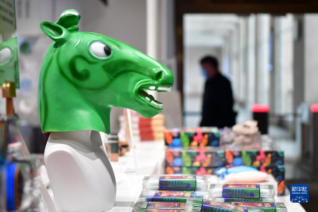 2022年5月13日,在位于蘭州的甘肅省博物館文創商店內,以銅奔馬和抗擊疫情為主題設計的“綠馬頭套”十分搶眼。銅奔馬又稱“馬踏飛燕”,是甘肅省博物館的“鎮館之寶”。近年來,甘肅省博物館推出以銅奔馬為主題的系列文創產品,讓文物走進生活,受到人們喜愛。