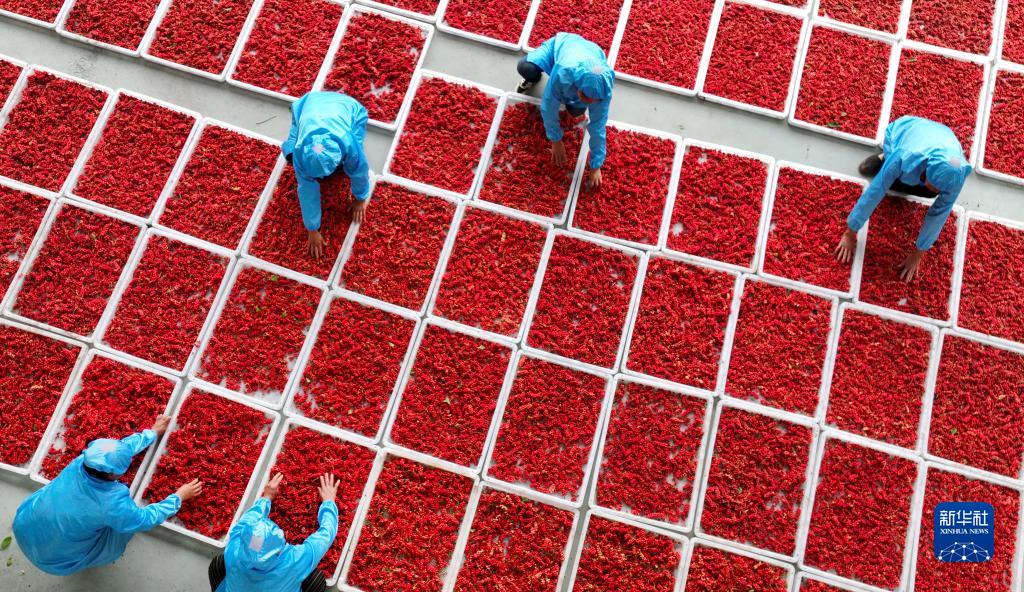 2022年8月21日,陜西省商洛市洛南縣煜正中藥材專業合作社的員工在晾曬新采摘的五味子(無人機照片)。位于秦嶺腹地的洛南縣依托獨特的山水優勢和氣候條件,借助蘇陜協作的對口幫扶,形成以五味子為主導產業的特色種植,同時積極發展五味子苗木繁育,加大系列產品的研發力度。五味子成為當地助力鄉村振興、促進群眾增收致富的“金串串”。