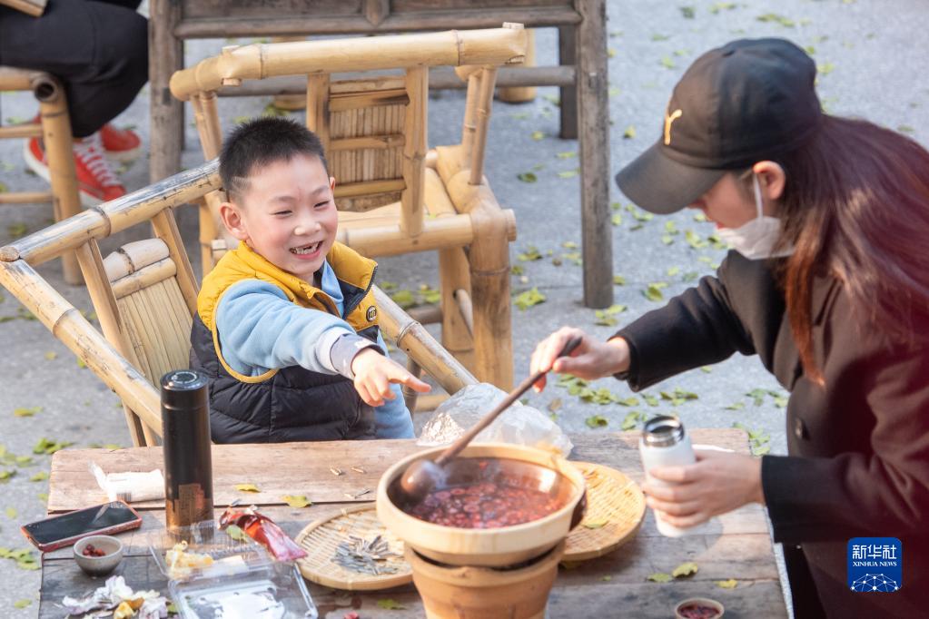 12月24日,在位于重慶解放碑商圈的著名景點山城巷的一家店內,游客品嘗特色餐飲。