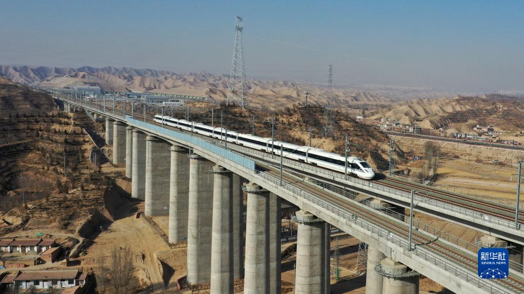 12月26日,一趟試運行動車組列車在銀蘭高鐵上行駛(無人機照片)。