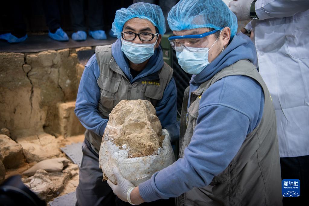 12月3日,考古隊員展示提取離土的頭骨化石。