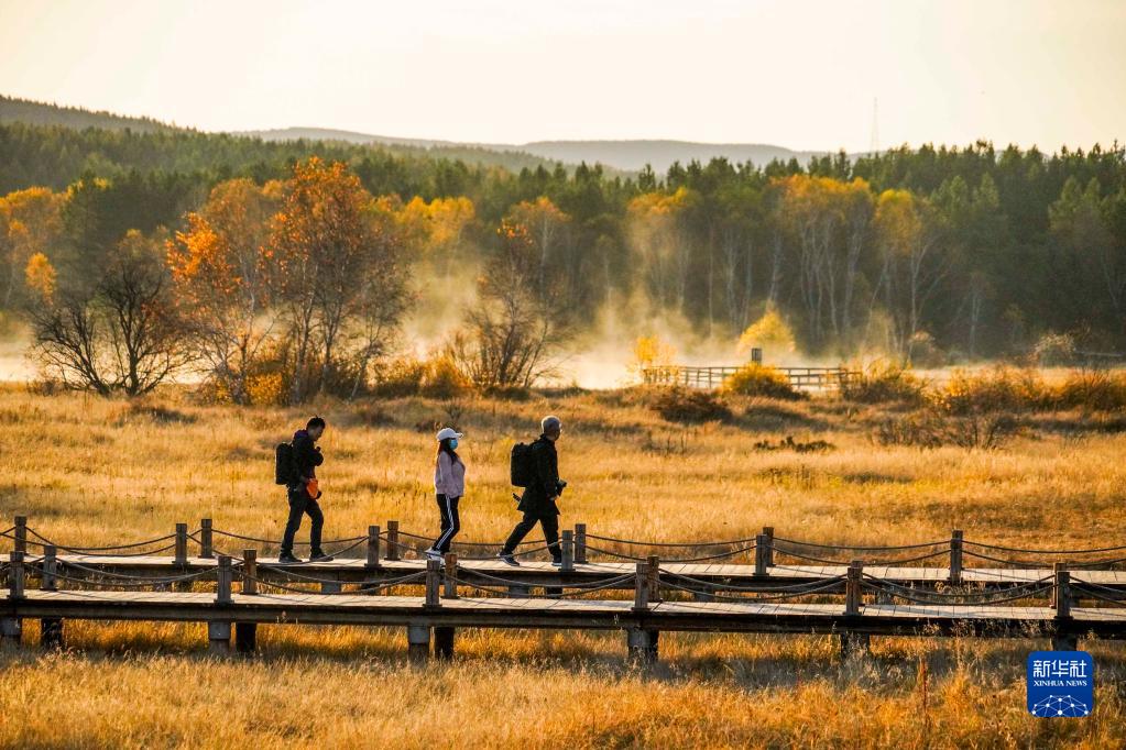 游客在位于承德市的河北省塞罕壩國家森林公園欣賞秋日晨景(2022年9月29日攝)。