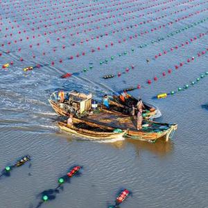目前,山東省榮成市各大海洋牧場貝類、藻類養殖正處于冬季管護期,漁民們駕駛漁船在海面上穿梭,進行添加養殖浮漂、清理海草及投喂餌料等作業,呈現出一派“海上冬耕”生產的繁忙景象。