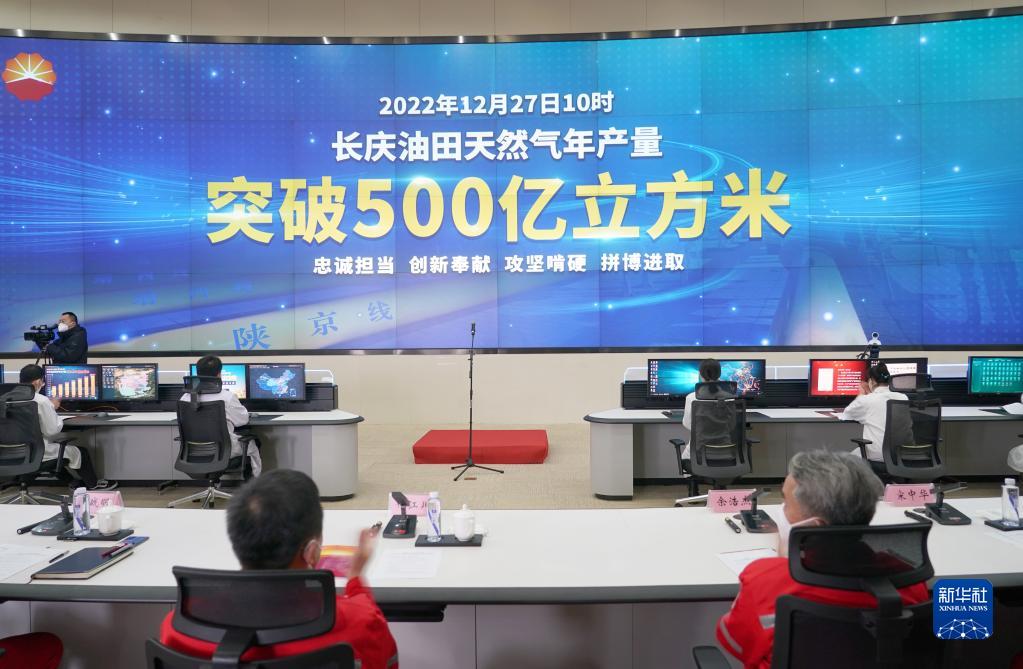 12月27日,在位于陜西西安的中國石油長慶油田生產指揮中心內,電子屏上顯示天然氣年產量突破500億立方米。