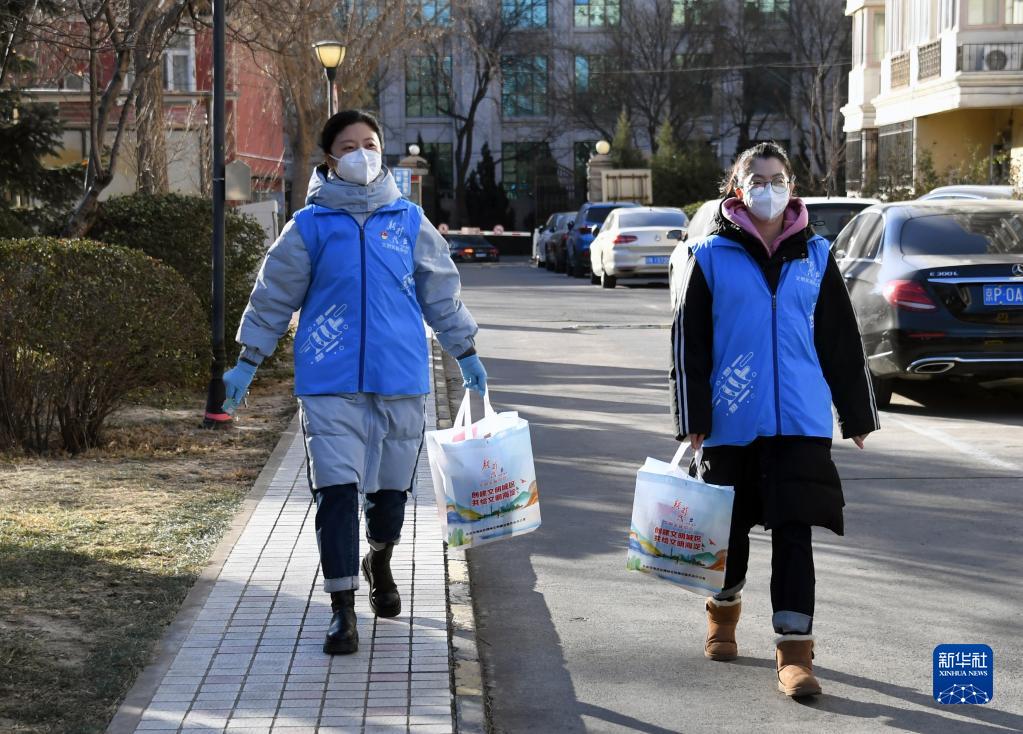 12月27日,在北京市海淀區羊坊店街道玉南路9號社區,社區工作人員為老人送“防疫愛心包”。