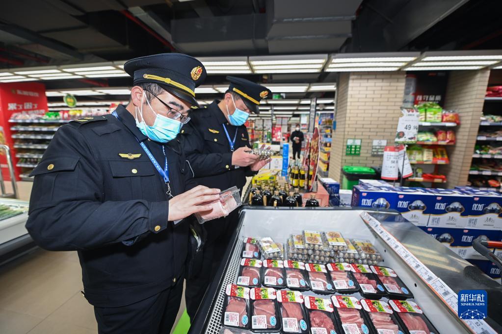 12月27日,在嘉興市一生鮮超市內,嘉興市南湖區市場監督管理局執法人員檢查生鮮貨品的來源和價格。